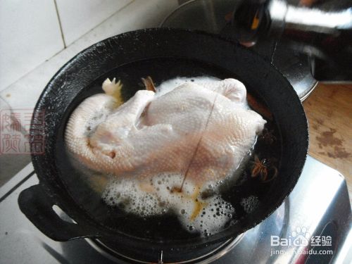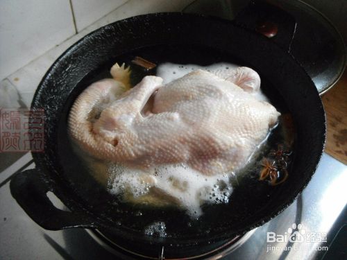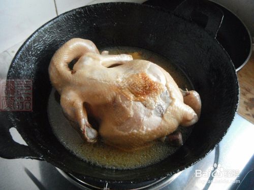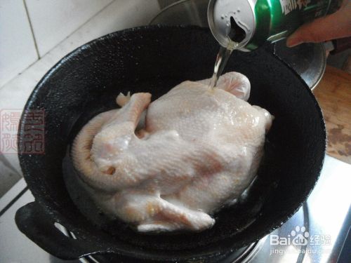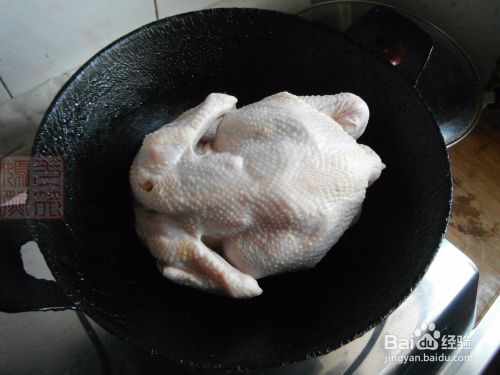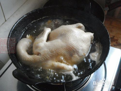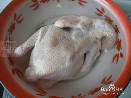 将广东清远鸡用清水浸泡1小时,清洗干净,将大葱塞入鸡肚子内,再把鸡爪子也塞进去,