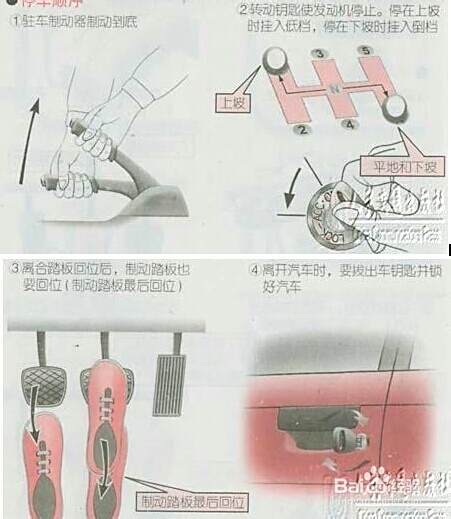 停车。要记住停车的正确操作顺序。停车时如果驻车制动器(手刹)制动力小,有时车会溜车。因此,驻车制动时一定要用力拉驻车制动杆直到听到“咯咯”声音为止。