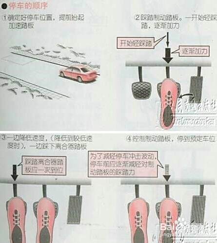 停车时,应早一点收起加速踏板。制动踏板的踩踏方法是:开时轻轻踩踏,慢慢加力,在停止之前逐渐减轻踩踏,逐渐练习,掌握消除停车时冲击波动的方法。 1)停车的顺序 :