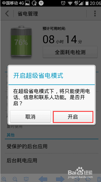 然后手机会自动弹出一个对话框,询问你是否开启超级省电模式,点击【开启】按钮,你的超级省电模式就已经被开启了。