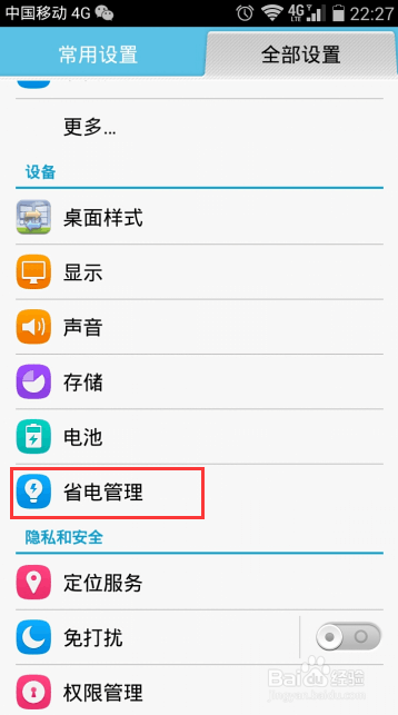 进入到手机【全部设置】的页面,然后在菜单中点击【省电管理】字样的按钮。