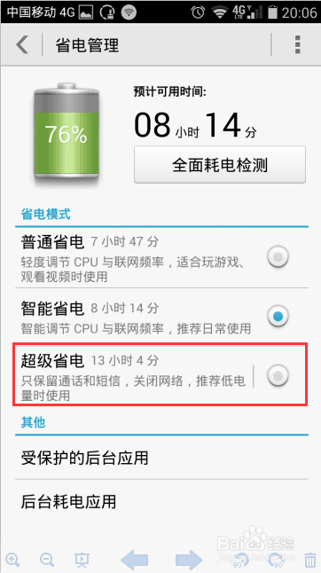 超级省电模式最省电,但是他只能够发短信和打电话。超级省电模式会自动关闭网络以节省你手机的电量,我这里以超级省电模式为例,点击【超级省电】。