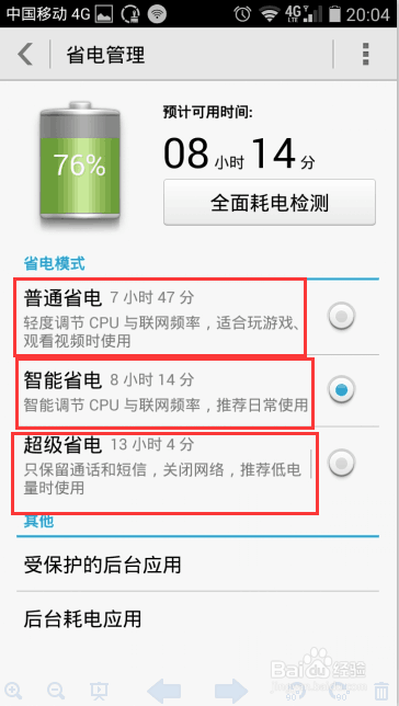 点击以后,进入到省电管理的页面,这里有三种省电模式,【普通省电】,【智能省电】和【超级省电】模式。
