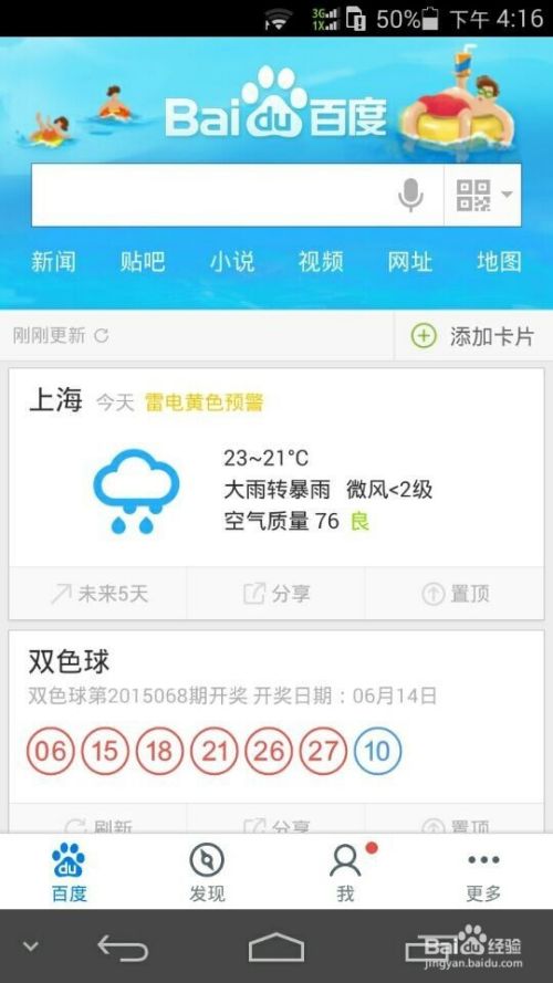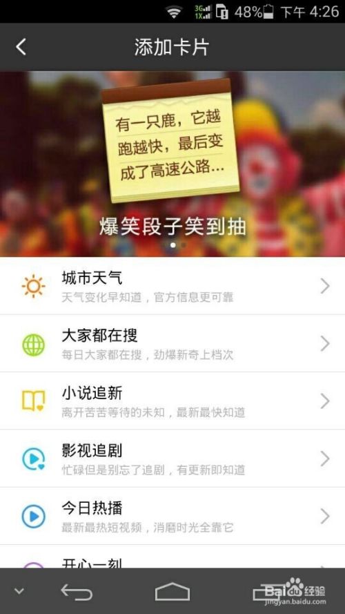第二步,点击手机百度首页“添加卡片"如下图。会出现添加卡片的页面。