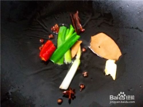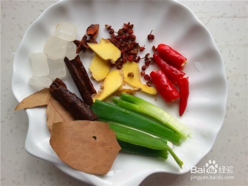 姜切成片,葱切成段,辣椒剪成段,再准备好花椒粒、香叶、八角和桂皮。