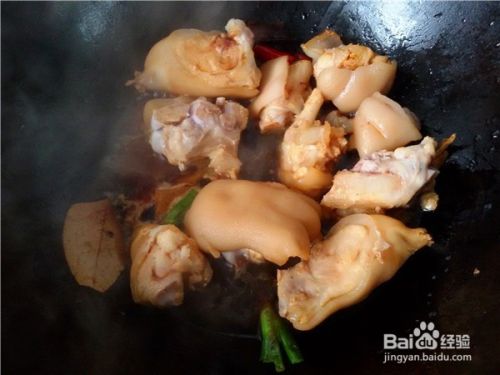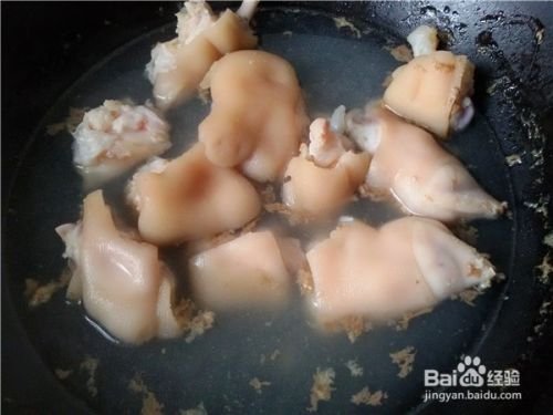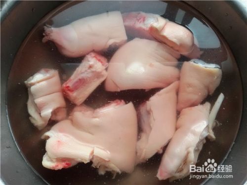 猪蹄斩成小块,泡去血水,多换几次水,冲洗干净。
