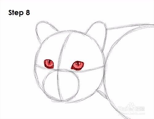 第8步:使用线条作为放置指南,轻轻地勾画出豹猫头部的眼睛。一旦你获得了放置和形状的权利,请将眼睛的轮廓变暗。眼睛的形状应该与小足球相似。在每只眼睛的内部画一圈实际的眼球。在每只眼睛的内侧画一条小狭缝,用于狭窄的瞳孔。除了一个小圆圈以外,使眼球变得黯淡。使用比瞳孔轻的值对眼球进行着色。也遮蔽眼球外部的眼睛部分。使用与其余眼睛的瞳孔几乎一样黑的值。