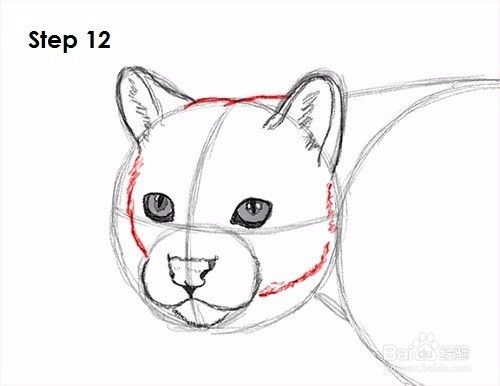 第12步:用原始圆圈作为引导,画出山猫头部的其余部分。按照圆的基本路径,但使头更薄。为纹理使用快速,简短的笔划。下巴线应该比原始圆高。