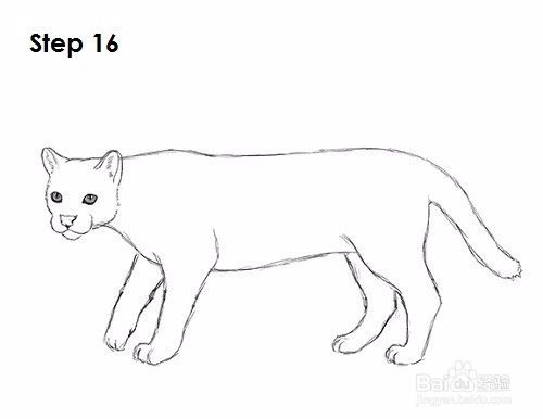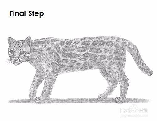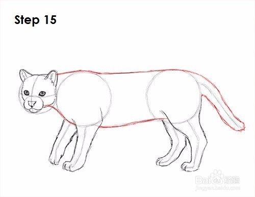 第15步:使用剩余的线条作为指导,绘制豹猫身体和尾巴的其余部分。当您变暗线条时,按照指南的路径行走。使尾部的形状更厚。Ocelots的尾巴相对较短。为了节省页面空间,尾巴在这里缩短了。