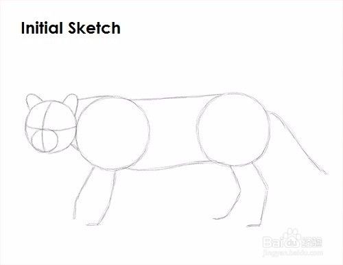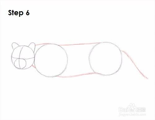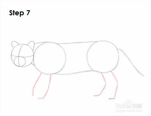 第七步:在身体下方画四条线(每个大圆下面两条)作为豹的腿的指南。弯曲线条以指示关节和脚的位置。