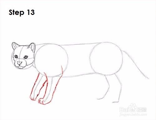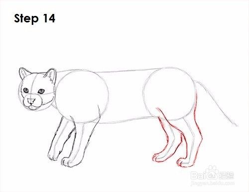 第13步:使用左侧的线作为指导,画出豹猫的前脚。当您沿着线条的基本路径轻轻地勾勒出第一条腿的形状。为关节弯曲一点。当你的结构正确时,将线条变暗。使用快速,短的笔触为毛皮。在脚趾的底部添加几条曲线。使用另一条线在另一侧绘制前腿。这只豹正在向前走,所以在勾画结构时将脚向下画。