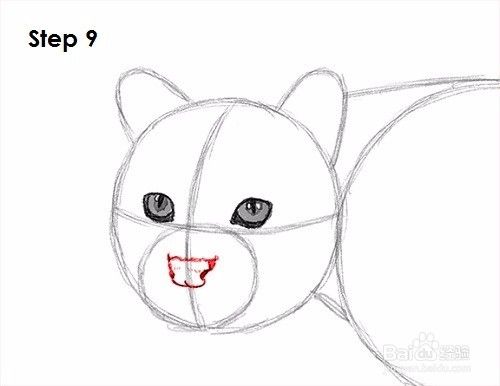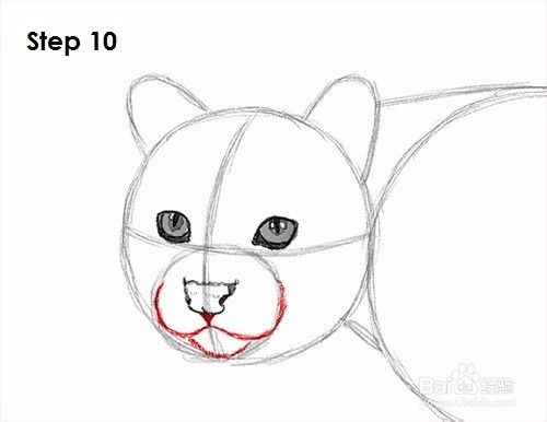 第9步:首先轻轻画出长方形的形状,画出枪口内的鼻子。变暗形状的两侧以创建鼻孔。添加底部部分。在鼻子顶部使用快速,短的笔画来表明毛茸茸的纹理。