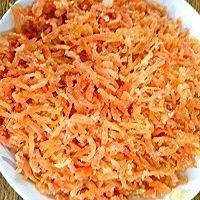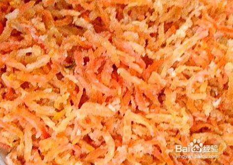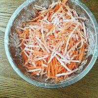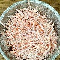 再抓些澄粉拌第二遍,让每根胡萝卜丝都被包裹住。拌好后,均匀撒些盐,再抓匀。