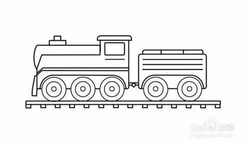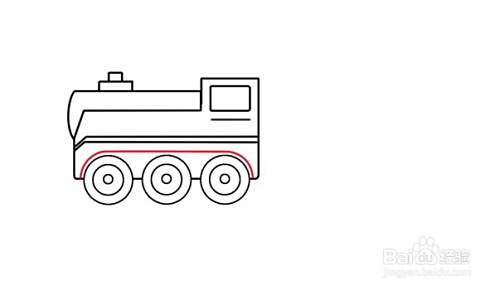 然后,以车头最下方轮廓线为中心,画轮子。先画一小圆,再在小圆外画一个稍大的同心圆,再在其外部画一个大的外圆,轮子就完成了。用同样的方法在其旁边连续画2个这样的轮子,让这个3个轮子排列在最下方轮廓线上。