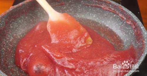 将淀粉水倒入草莓酱中,边倒边搅拌,搅拌至粘稠状态。