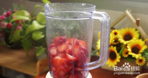将草莓放入榨汁机,倒入150克水,榨成草莓汁。