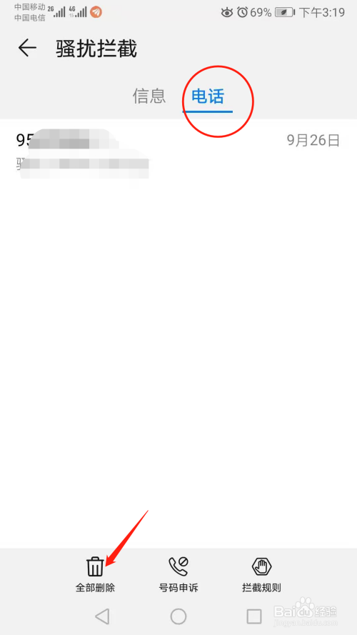 或者,点击【信息】旁边的【电话】,如下图所示,被拦截的电话就会显示出来,点击【全部删除】即可,如下图示所示。当然,如果是删除【信息】,就在信息界面点击【全部删除】