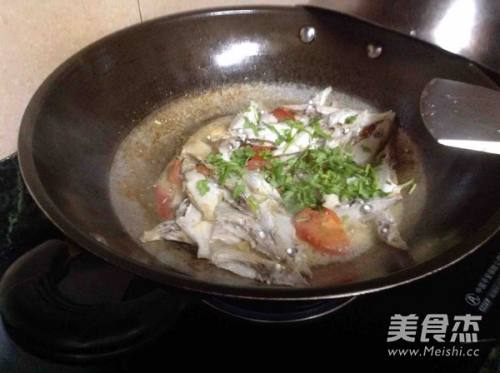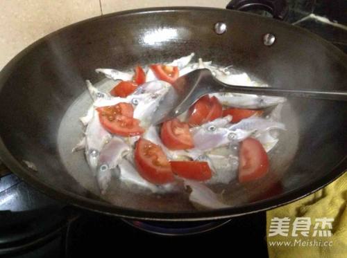 锅中放入油,加入切丝的姜,放入清理好的剥皮鱼,煎5分钟,放切成块的番茄,加入水