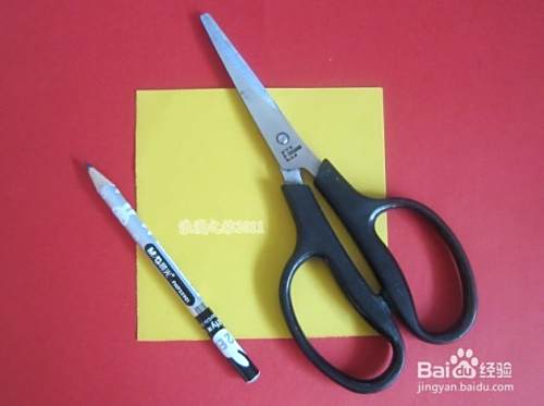 首先准备好剪纸材料,一张正方形的纸,一把剪刀,一支笔,如图所示。