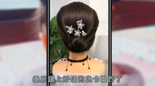 7最后用小皮筋固定,往上翻转,将发尾塞进去,带上发卡即可。