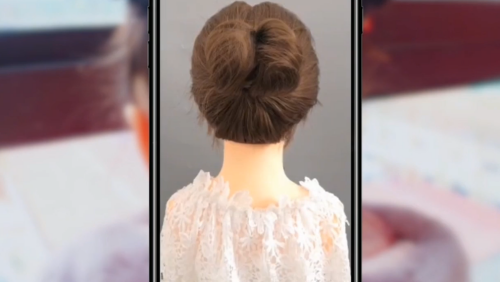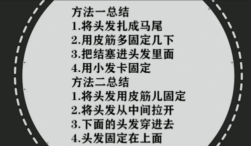 4将头发从中间拉开,下面的头发穿进去,最后固定在上面。