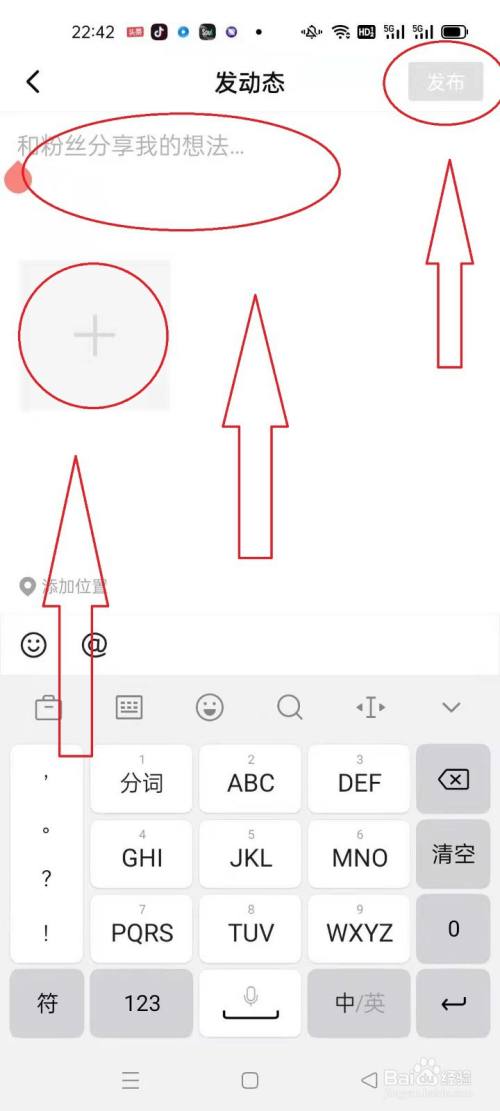 4、进入编辑发布页面后,首先输入动态详情,然后插入图片,最后点击右上角的“发布”,如图