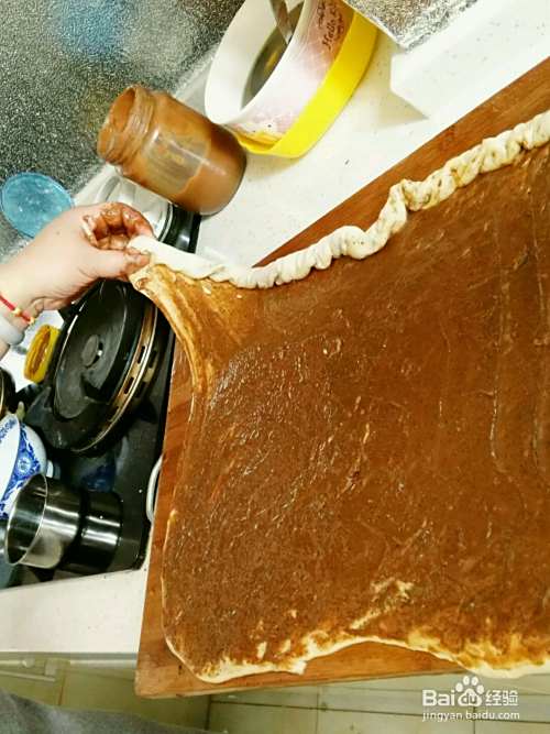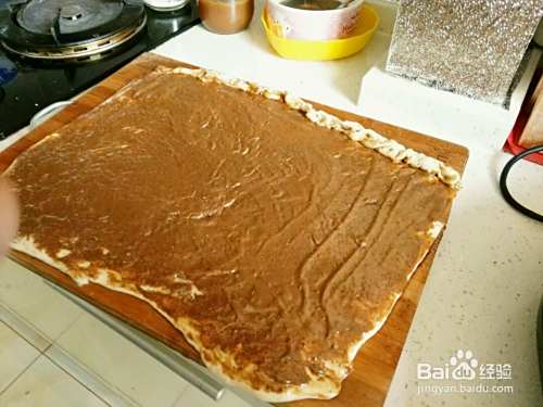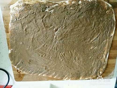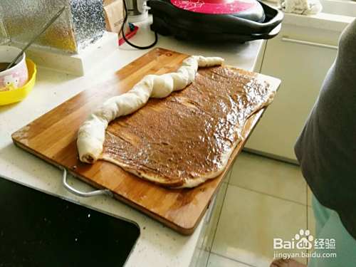 抹完麻酱后从面片的最上边顺着一边一点儿一点儿卷起,卷时候尽量拉薄