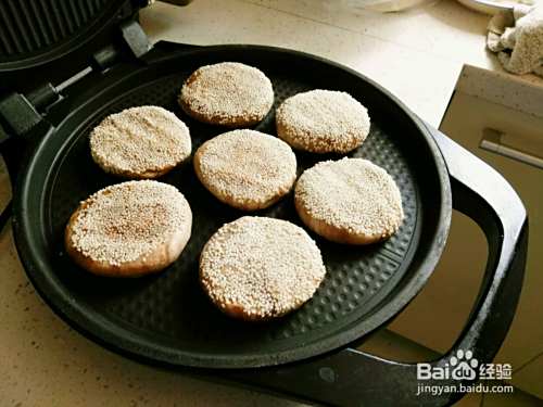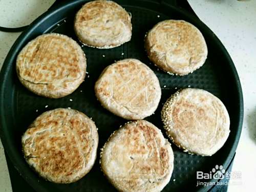饼铛烧热后,把烧饼底边朝下轻按在饼铛上