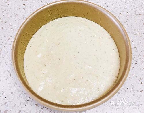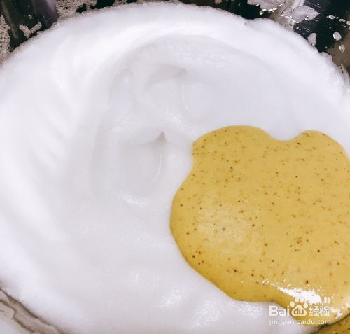 把蛋黄糊倒入打好的蛋白中翻拌均匀(画十字的方法快速翻拌,切记不能画圈搅拌,否则会消泡)