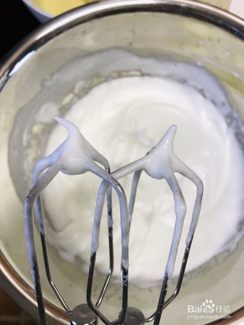 蛋白打发至七分发,成弯钩状。