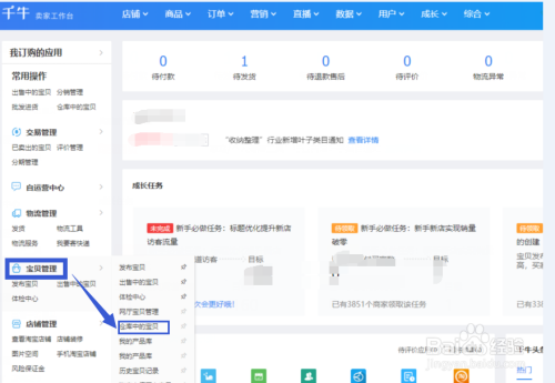 返回千牛卖家工作台,找到宝贝管理选择仓库中的宝贝。