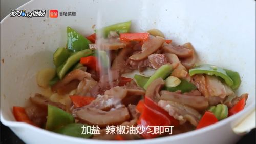 3蒜片煸香,加入猪头肉、姜粉、孜然粉,倒入辣椒翻炒两分钟。