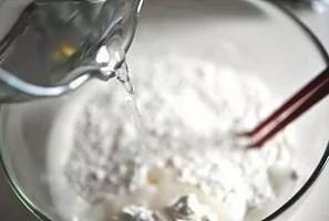 面粉中慢慢加入温水,边加入边用筷子搅散成棉絮壮