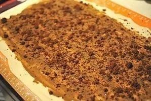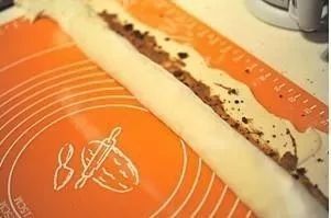 面团擀开,饼皮可以稍薄一些,但饼皮下面一定要放足薄面,避免面太软粘住不好卷起。撒上芝麻酱,用勺子抹匀