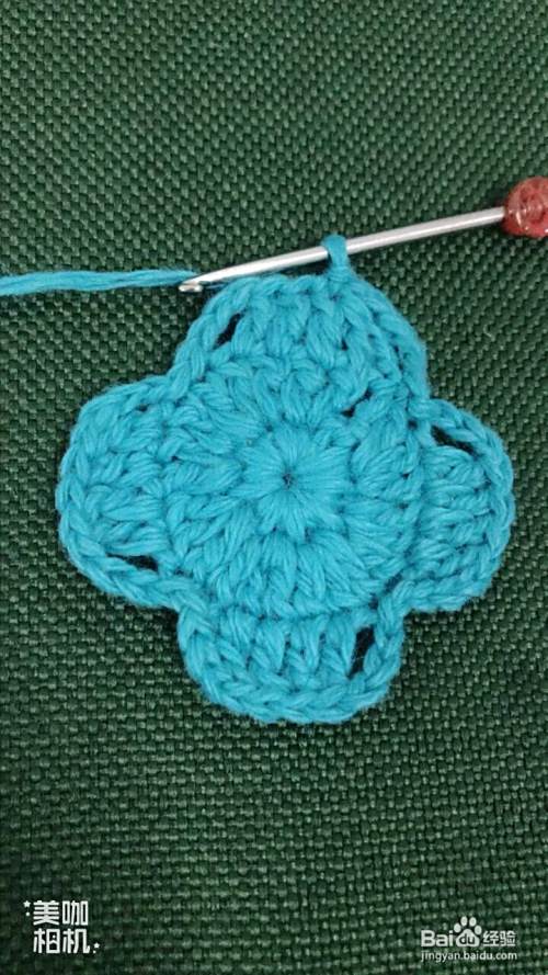 在下一个针孔里面,继续拉花三针,钩中长针4针,拉花3针,紧锁到针孔里面。按此步骤操作完成一朵4瓣花。