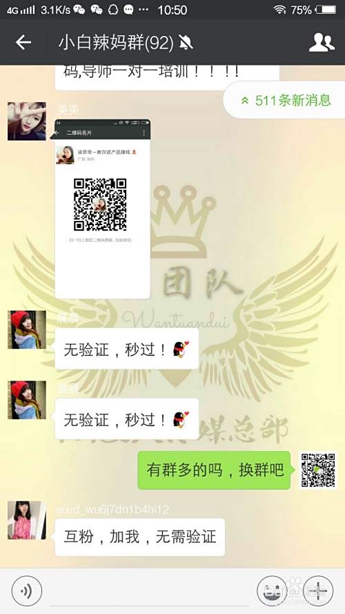 如果你比较喜欢在群里加人,但是又不愿意花钱去置顶你的群二维码,那么你可以试试在一个群里发广告语提出跟别人换群,即让拥有其他微信群的人拉你进行新的群,假如一个人有五个群,那么你跟十个人换群,你就等于多了五十个群,资源可是很丰富的。
