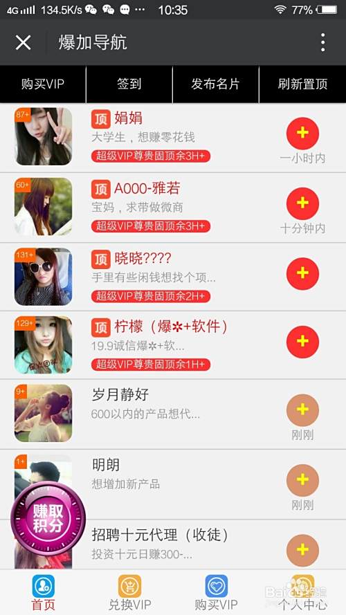 这是很多微商团队都会教给小白的一种方法,扫描一个专做人脉的公众号,关注之后按要求先添加平台上的几个微商,然后将自己的微信二维码上传到平台,写上一句自我介绍的引流语,即可等待别人来添加。如果想要让自己的信息置顶,往往需要通过做任务或是充值来兑换VIP权限。
