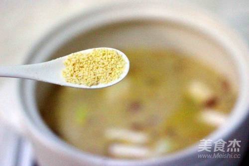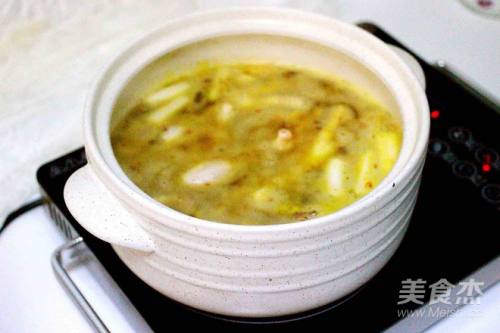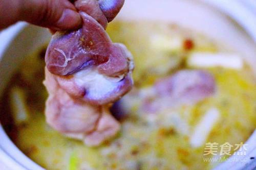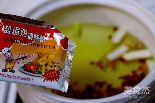 7倒入盐焗鸡粉、加温过程中、需搅拌均匀、使盐焗鸡粉充分融入汤底