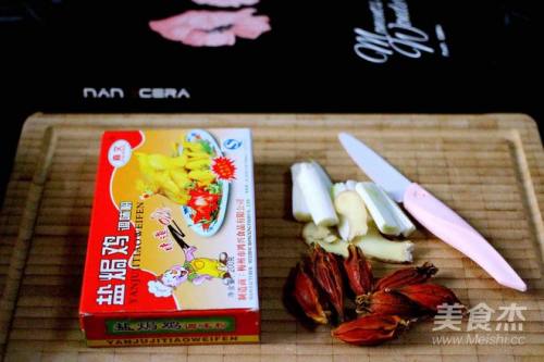 2葱用刀切段、姜切成片、栀子洗净备用、盐焗鸡粉准备好