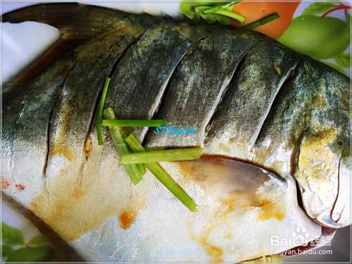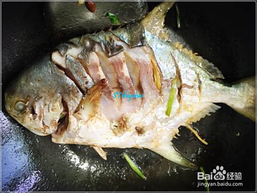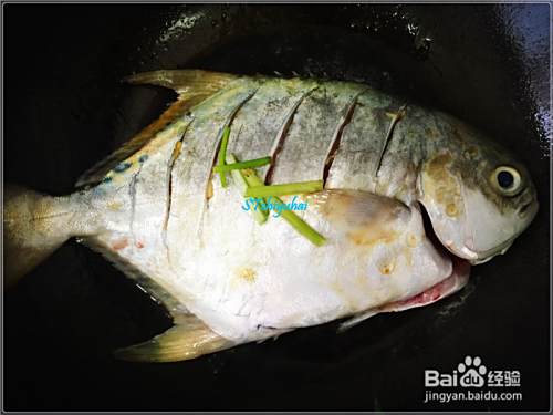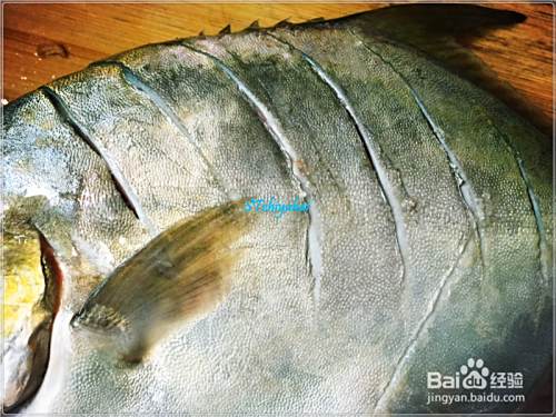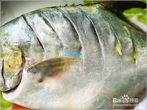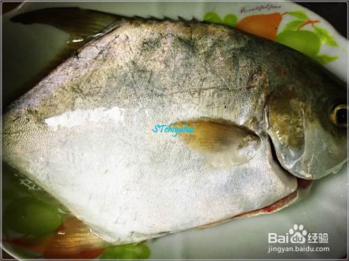 挑选一只新鲜的金鲳鱼,看鱼眼睛,清澈有神不发白的为佳,同时最好活蹦乱跳有活力的。让卖鱼师傅帮忙处理一下鱼,带回来自己清洗几遍,鱼肚内也要用水冲一冲,然后用刀将鱼两侧划开一些口子。