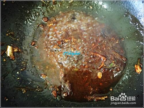 这道菜的主要拌料--豆瓣酱,先取出少部分少量加入到锅中。大火煮沸了一会后转成中火,中火慢慢熬去汤汁,待水快干时转大火,基本上酱汁粘锅就差不多了,将鱼捞出。