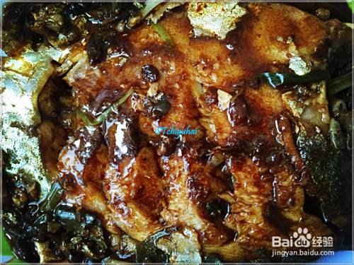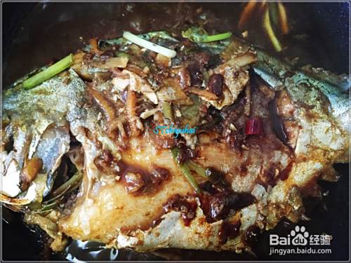 一边油炸一会后翻转至另一边,两边都油炸一会,然后倒入刚才腌制的酱汁,再加入少许盐巴、酱油、料酒、醋等调料,如果还有姜丝、蒜末、小葱等,也新加入一些。然后加入大约到鱼身一半的水,转大火煮一阵,要翻动鱼,让其各部位受热均匀。