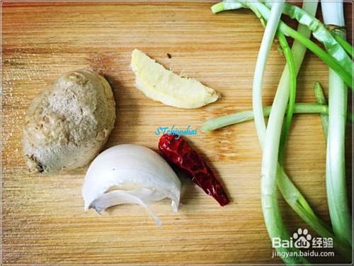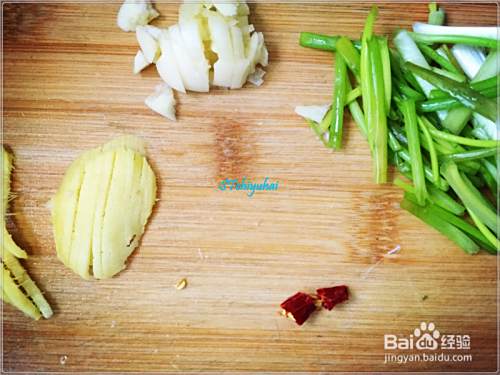 准备辅料:生姜、蒜头、辣椒干、小葱等,将生姜洗净去皮切成细丝,蒜头拍碎去皮切成小块,辣椒干洗净切成小段,小葱也是同样处理。