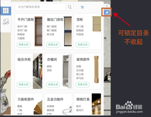 分为柜体目录和饰品目录: 柜体目录包含 平开门柜、推拉门柜、顶柜、万能柜部件等。