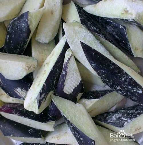 长条茄子一根,不去皮,切成长约6厘米的滚刀块。放入两勺干淀粉,搅匀,让每块茄子都沾有一层薄薄的淀粉。