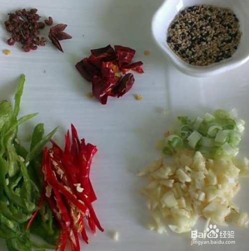 青椒,红椒切丝,干辣椒切碎。葱蒜切末,花椒芝麻等辅料备齐放入盘中备用。(根据自己口味决定辣椒的多少。)