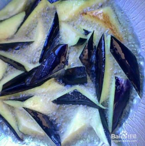 锅中放油,油热倒入茄子,炸至微微焦黄捞出备用。(注意,不要炸的时间过长,否则会影响口感。)