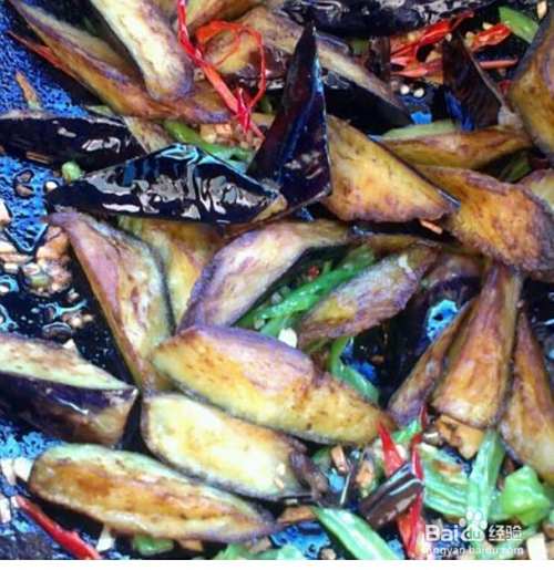 将炸好的茄子块,青椒丝,红椒丝放入锅中。倒入调好的料汁,大火翻炒几下即可。(翻炒时间不宜过长。)