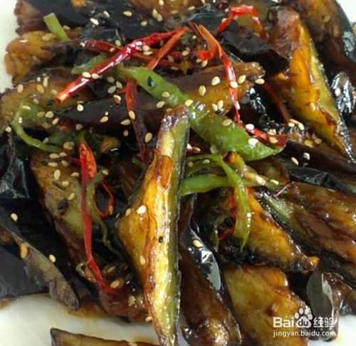 将炒好的茄子放入盘中,撒上一些熟芝麻即可上桌。