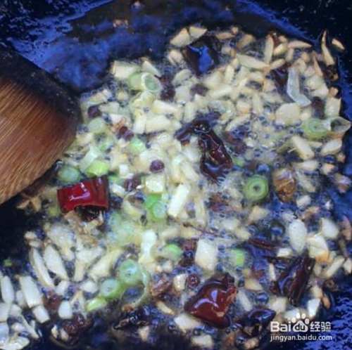 锅中留下少量油,放干辣椒,花椒,八角炸香,再放入蒜末,(炒出香味即可。)